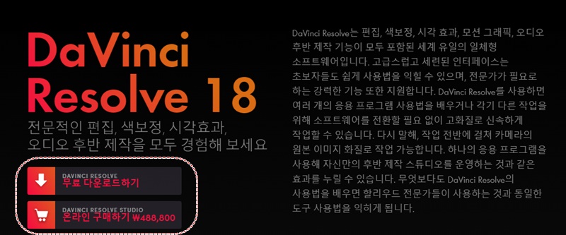 영상편집, 색보정, 시각효과, 모션그래픽, 오디오 후반제작 기능 모두 포함된 일체형 소프트웨어 입니다.